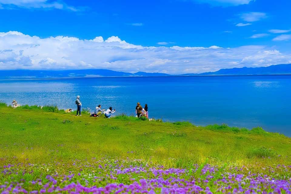 春:湖畔冰雪消融,野百合、金莲花等高山花卉竞相绽放,草原初绿如茵;