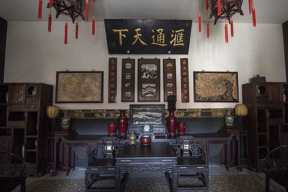 三大开间,车轿出入绰绰有余,门外侧有栓马柱和上马石,从东往西数,依次为老院,西北院,书房院。所有院落都是正偏结构,正院主人居住,偏院则是客房佣人住室及灶房。在建筑上偏院较为低矮,房顶结构也大不相同,正院都为瓦房出檐,偏院则为方砖铺顶的平房,既表现了伦理上的尊卑有序,又显示了建筑上层次感。大院有主楼四座,门楼,更楼,眺阁六座。各院房顶有走道相通,便于夜间巡更护院。
