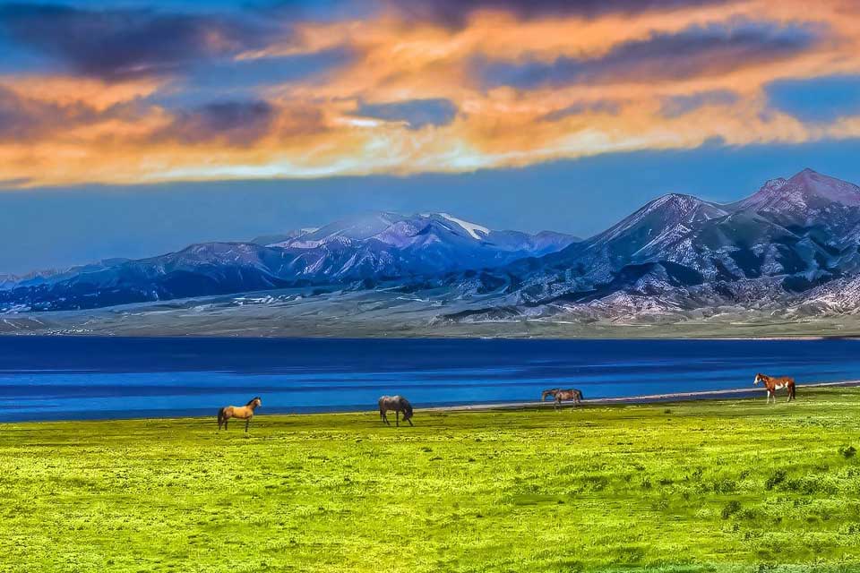 春:湖畔冰雪消融,野百合、金莲花等高山花卉竞相绽放,草原初绿如茵;