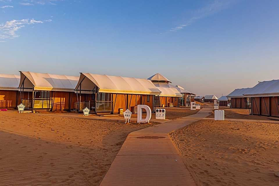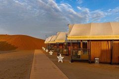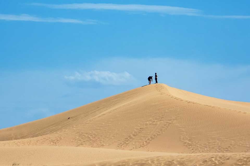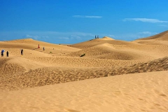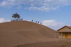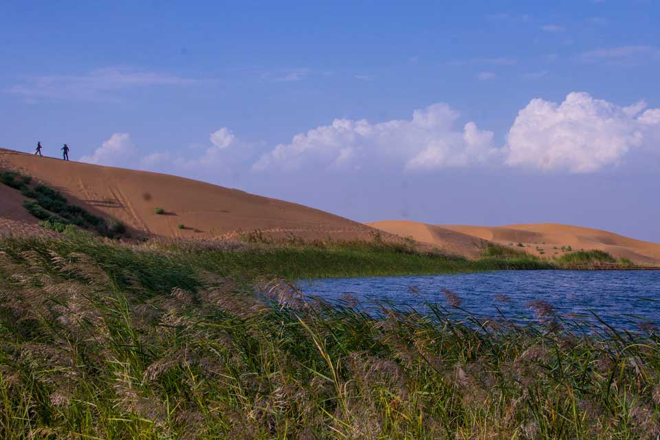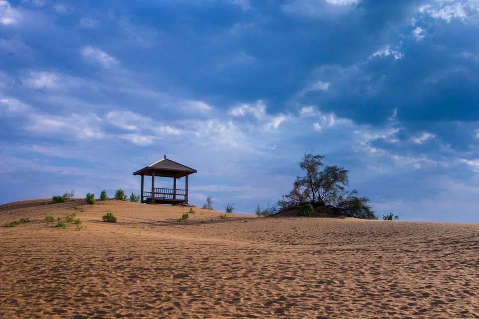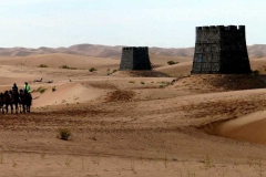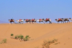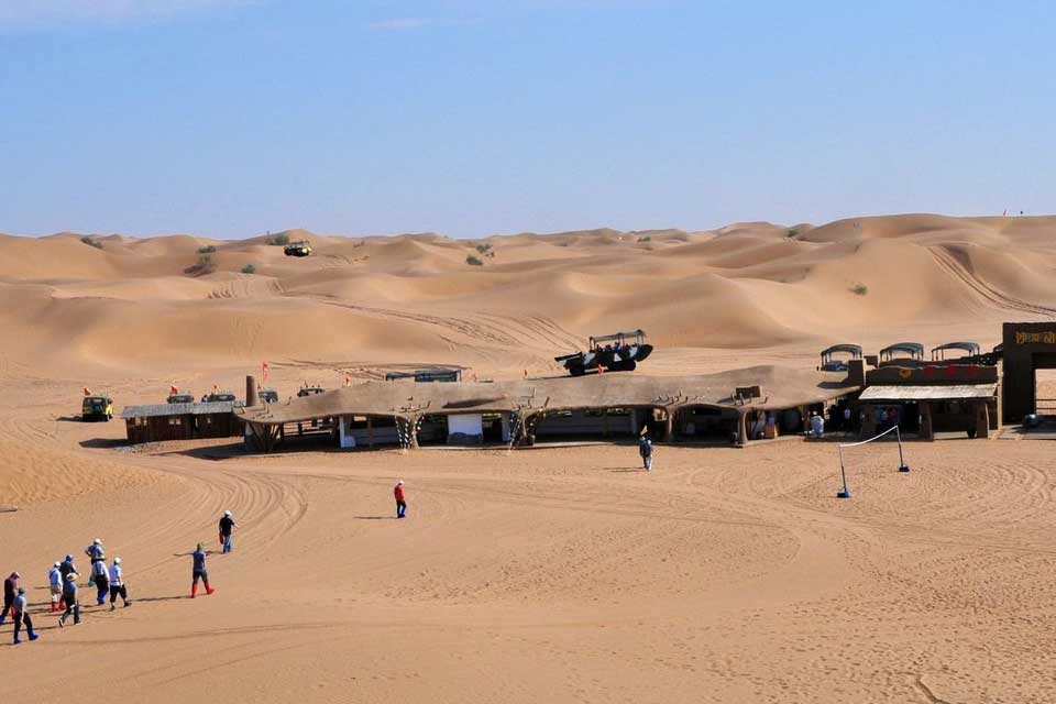 【丝路驼队】 骆驼是古丝绸之路时行走沙漠最重要的交通工具,它是连接欧洲和亚洲经济、文化和友谊的重要桥梁。沙天相连的无边沙海,连绵无尽的沙峰浪谷,游客可以骑骆驼身临其境,感受古丝绸之路的神秘之美。