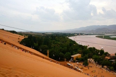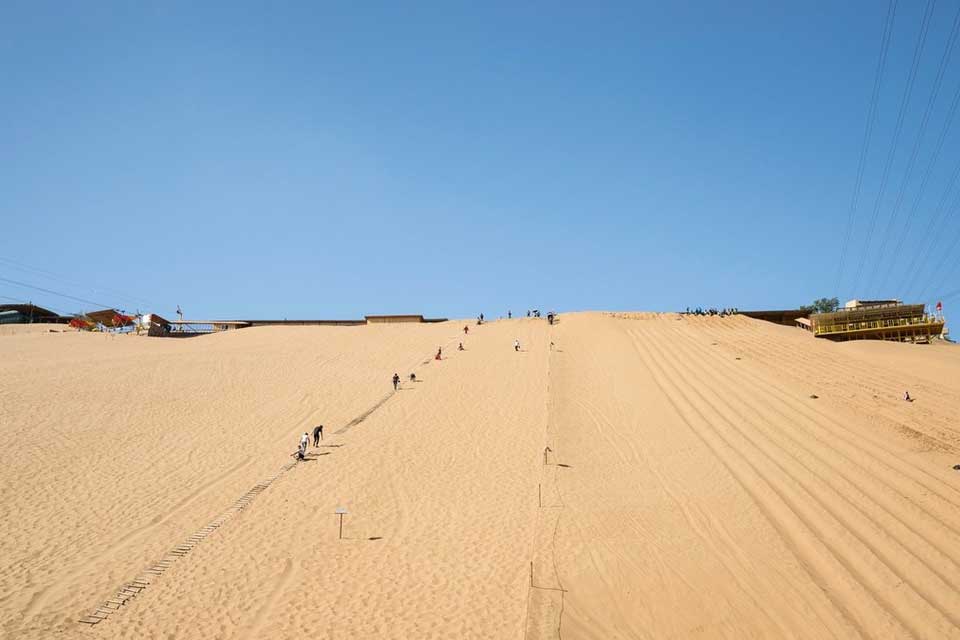 【沙海冲浪】 在沙坡头,有一条长200米、高80米的滑沙场,是中国境内最大的滑沙场。游客可乘坐滑沙板滑沙,从高处迅速滑落,大有沙海冲浪的感觉。