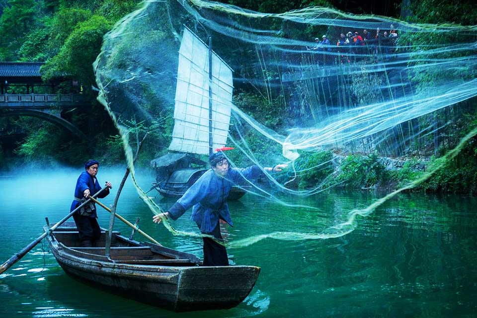 【水上人家】 为古帆船群景点, 位于龙进溪水与长江的交汇处,通过在近溪的一边筑起水坝拦截龙溪水,实现水位抬升1~2米。龙溪桥横跨水面,溪水碧绿,林木苍翠,“龙溪桥下春波绿,曾是惊鸿照影来”。此处主要表演渔民搭乘古帆船撒网捕鱼的场景,再现峡江渔民祖祖辈辈的生存方式和劳动习惯,延续古老的渔文化。