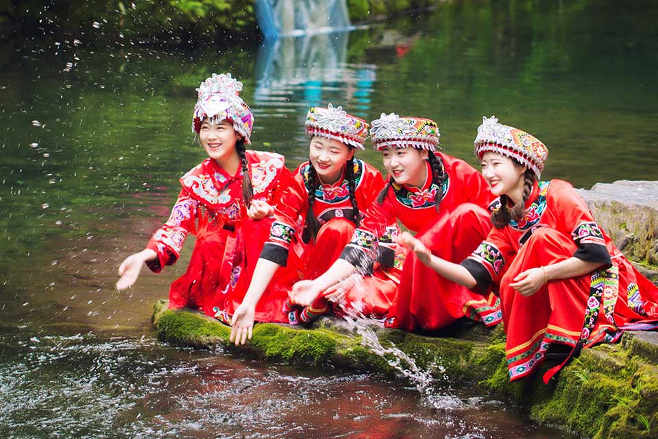 【溪边人家】依山傍水,一半着陆,一半入水。吊脚楼建筑景观,主要表演为山里妹子捶洗衣服、唱情歌的场景。